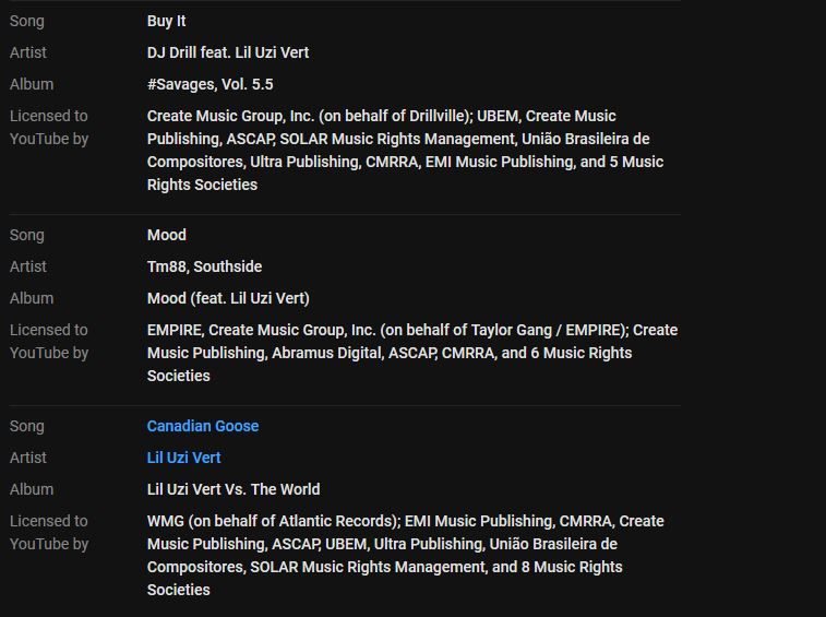 I kept scrolling down these videos and clicked to the licensing details and saw numerous songs where their rights were being claimed. One video called “Lil Uzi Vert Best Snippets That Released!!!!” featured five songs tagged through Content ID, but one stuck out to me.