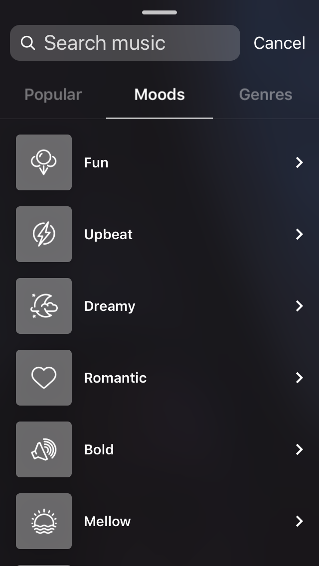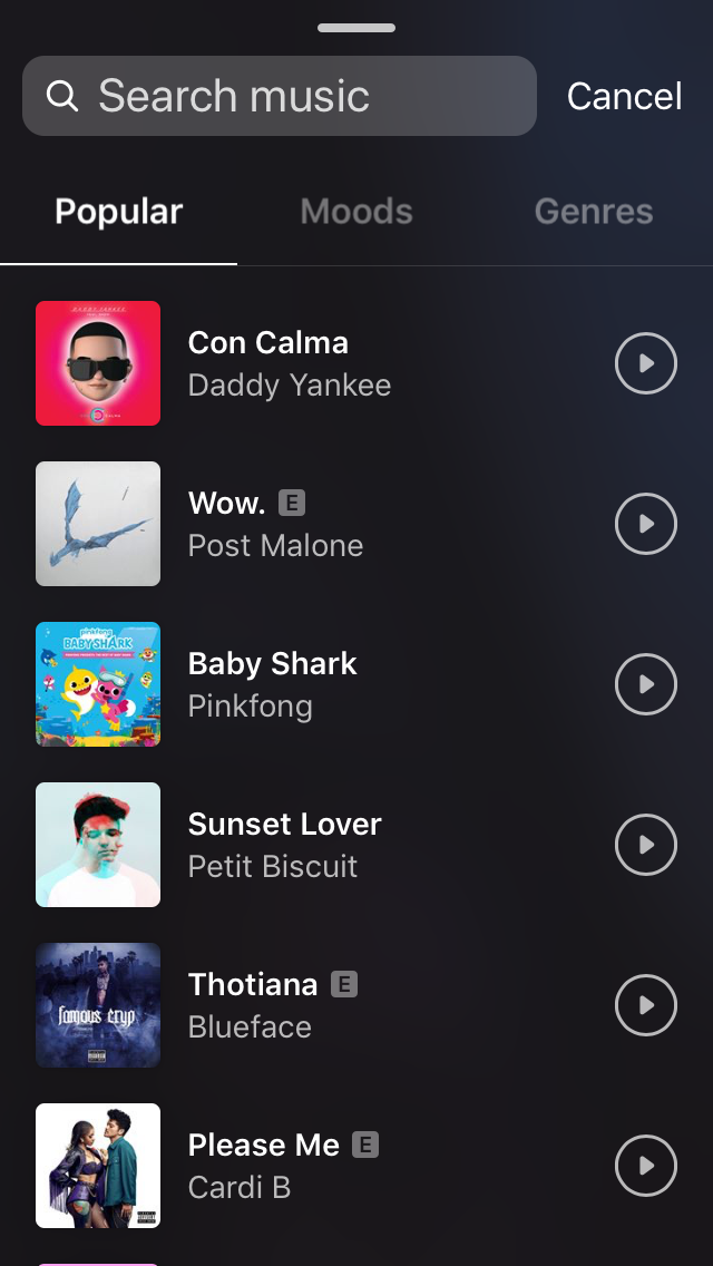 Back in 2016, Instagram introduced Stories, which were a wholesale rip-off of Snapchat’s own ability to record brief 10-second clips and allow fans to watch and comment on them. The simplicity of the feature feels so distant, as scrolling through Stories in 2019 is a cacophony of advertisements, reposts, special filters, weird memes, and far less of the boring slice-of-life content I originally enjoyed. Everyone’s social media feeds will vary but opening the camera to upload to Stories presents an almost overwhelming number of options for users. The initial one I wanted to highlight was the ability to directly upload ten second clips of songs into one’s Stories. I’ll admit that not many people I follow use the feature, but even with a lack of usage I found it an interesting area of the app to explore. Unsurprisingly, trap and Latin pop appeared to be the most popular music genres used in Stories, with a healthy amount of Indian pop in the mix. The influence of Songza on mood-specific categories (though often credited to Spotify) can be used in case one is stumped for the correct song to express happiness. Instagram was thinking of you!