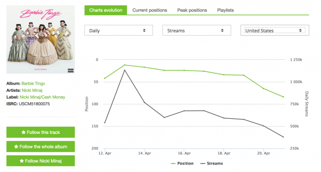 On Spotify “Barbie Tingz” was initially placed onto the Daily Lift, Teen Party, Hot Rhythmic, Pop Rising, and numerous New Music Friday playlists; “Chun-Li” was put on Hip-Hop Central, This Is How We Do, Who We Be and Women of Hip-Hop playlists. Both songs received fairly strong placement in those opening couple of days, but “Barbie Tingz” was being pushed on a pop track, while “Chun-Li” was headed to rap. When I initially saw how these songs were being put on particular playlist tracks my initial thought was that Barbie Tingz would outperform “Chun-Li” but that didn’t happen at all.