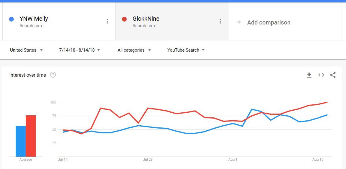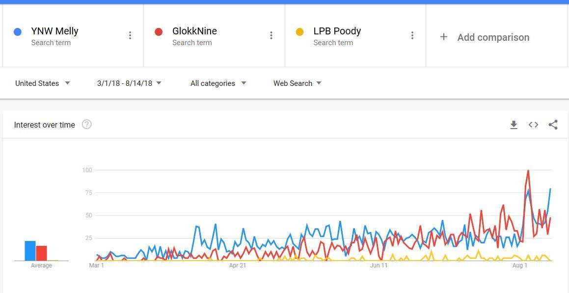 In the last thirty days GlokkNine is outperformed YNW Melly overall except for the release day of YNW Melly's album I Am You. I'll credit that with GlokkNine releasing his most recent mixtape (Loyalty Kill Love) on July 23. Yet, while YNW Melly's YouTube searched started to dip then bump after the release of I Am You; GlokkNine just kept racking up more searches. My gut places that factor on the dual news of a new mixtape and label signing rumors sustaining interesting learning more about the rapper. Where YNW Melly doesn't have multiple news pegs for people to search his name.