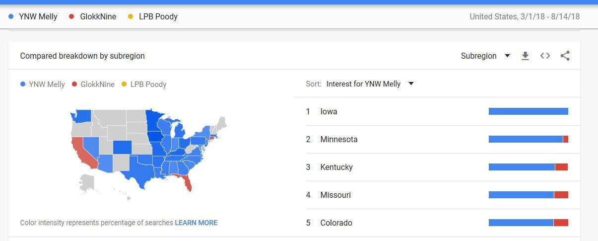 YNW Melly, if there were the electoral college system would be blowing GlokkNine out of the water. There are only three states (California, Florida, and Connecticut (?!)) where GlokkNine is outperforming Melly. Here I'll end with a bit of wild conjecture that GlokkNine doing better in their local state, so earlier in their careers is perhaps a sign that he might have a stronger fan base since his growth is occurring regionally rather than quickly dispersing across the states...but truthfully that's just my gut projecting a lot.