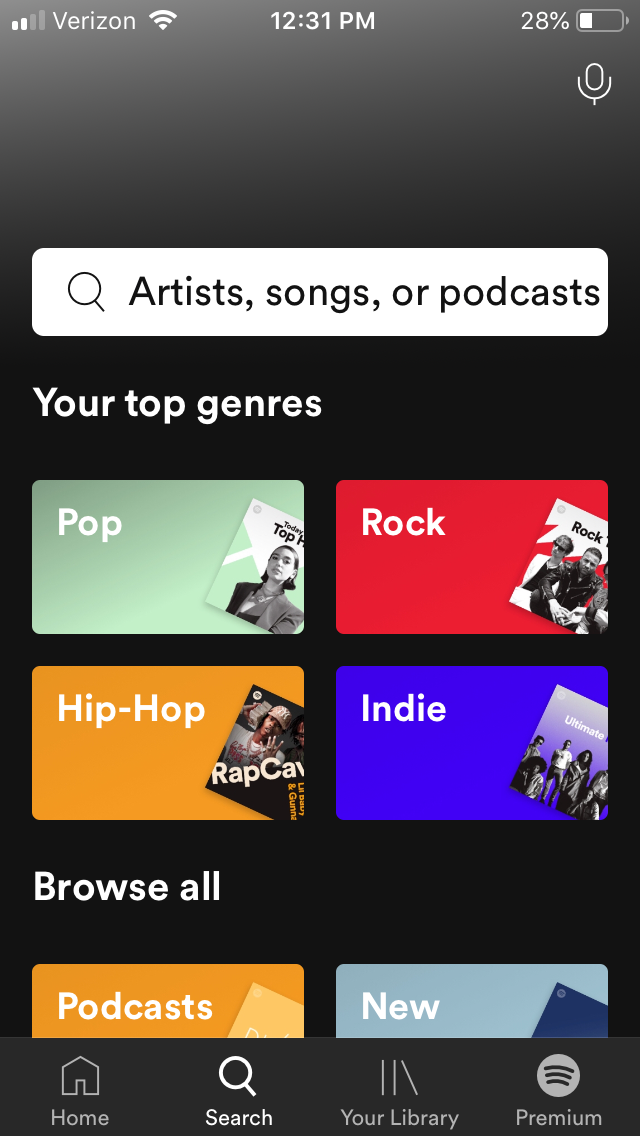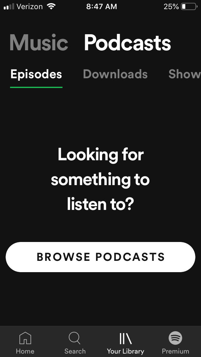 Here is the search screen. The search screen didn’t change with the recent update but I wanted to stress how this podcast shift isn’t a sudden one. The search bar says “Artists, songs, or podcasts” and when your eyes wander down to “Browse All”, the first thing that you’ll see isn’t “New Releases” but instead “Podcasts”. Again, it’s hard to imagine how a single company can support the lives of one million artists if the first thing users are prompted to do is check out an entirely separate medium of content.