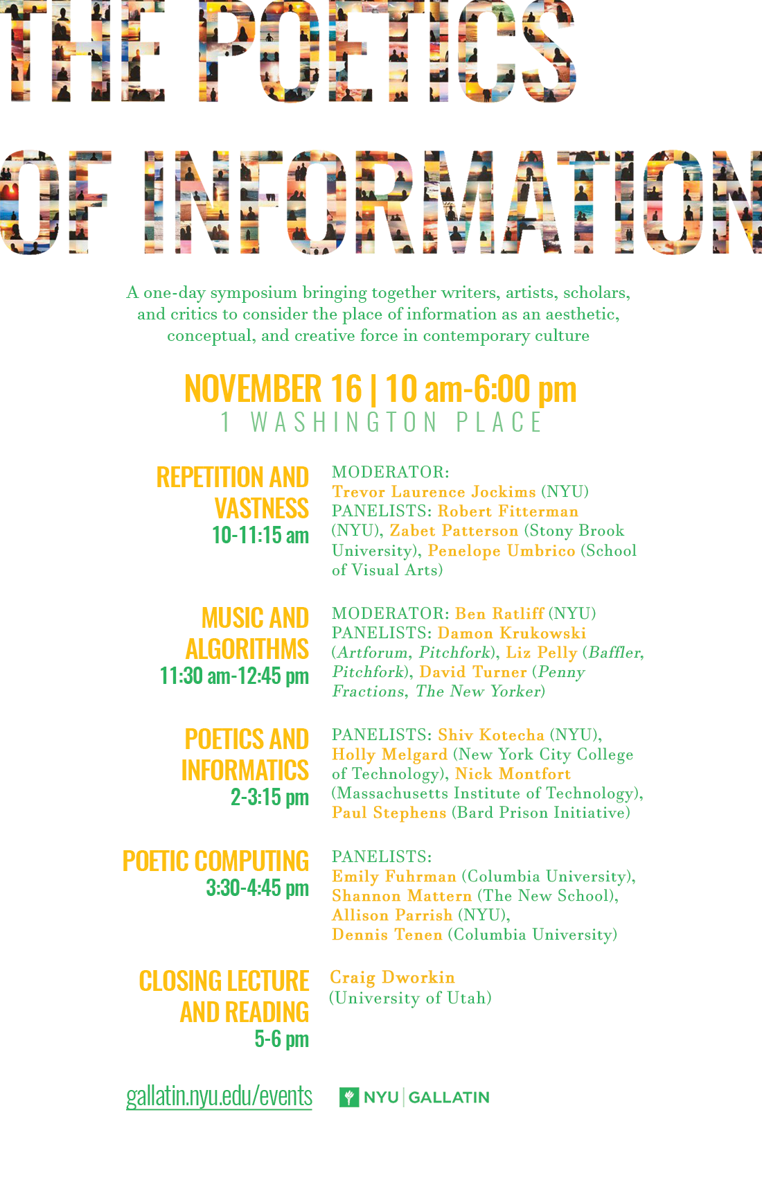 One last thing, if you happen to be in New York City and are somehow free at 11:30, please do catch me at The Poetics of Information Symposium hosted by New York University at 1 Washington Place. I’ll be on a panel with Liz Pelly (da gawd) and Damon Kurkowski (goat), who I’ve cited here before, which will be moderated by Ben Ratliff (da gawd II). Below is a flyer, if you can make it let me know and I can say hey!